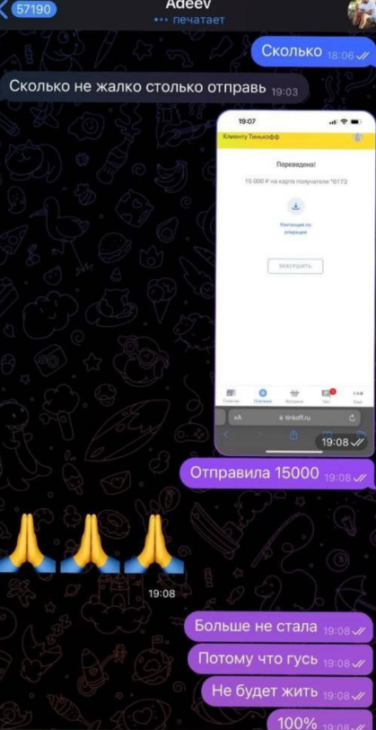Адеев требует, чтобы Бухынбалтэ оплачивала лечение и реабилитацию гуся, Кристина перевела 15 тысяч и сказала Лёше, что птичка жить не будет. Если почитать откровения Кристины, то её пёс собирался спасти гусыню от тяжелой болезни.