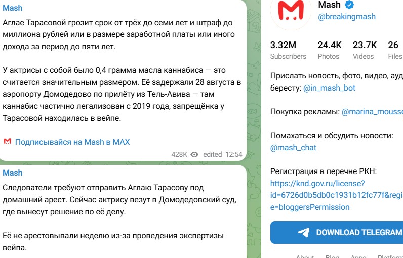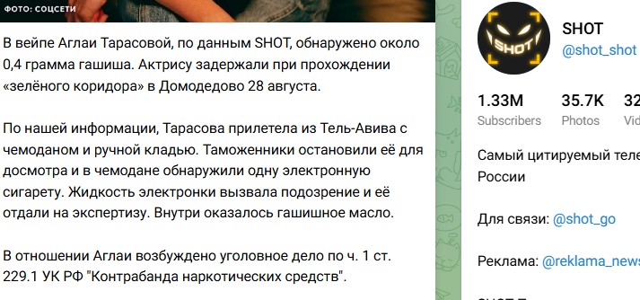По информации ряда известных изданий, Аглаю Тарасову задержали с вейпом, в котором находились запрещённые вещества. Содержимое электронной сигареты, которая была найдена при проходе Аглаей "зелёного коридора", вызвало сомнения у работников полиции, поэтому вейп был изъят, а его содержимое - отправлено на экспертизу. По итогу в вейпе было найдено запрещённое в России вещество, за провоз которого Тарасовой грозит реальное заключение под стражу и штраф. Уточняется, по отношению к Аглае возбуждено уголовное дело по статье "Контрабанда наркотиков" - ей грозит до 7 лет тюрьмы со штрафом до 1 млн рублей.