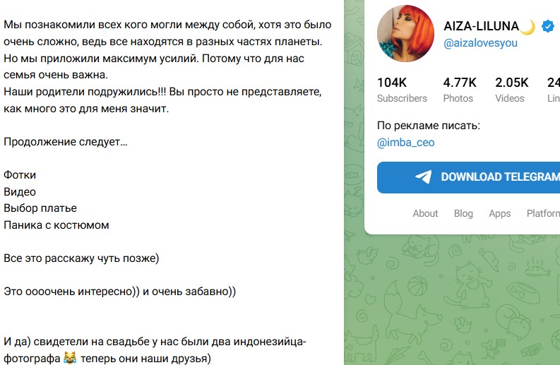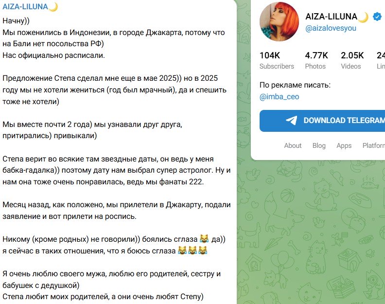 Как стало известно благодаря телеграм-каналу счастливой жены Кузьменко, 22.02.26 года Айза Долматова вышла замуж, заключив официальный брак на территории Индонезии. В настоящее время пара проживает на Бали, где нет посольства России, поэтому им пришлось несколько раз мотаться в столицу. "Степа верит во всякие там звездные даты, он ведь у меня бабка-гадалка)) поэтому дату нам выбрал супер астролог. Ну и нам она тоже очень понравилась, ведь мы фанаты 222(орфография и пунктуация автора сейчас и далее сохранены)", - написала Айза на своей странице в социальных сетях. "Никому (кроме родных) не говорили)) боялись сглаза 😹 да)) я сейчас в таких отношения, что я боюсь сглаза 😹😹😹", - добавила она.
