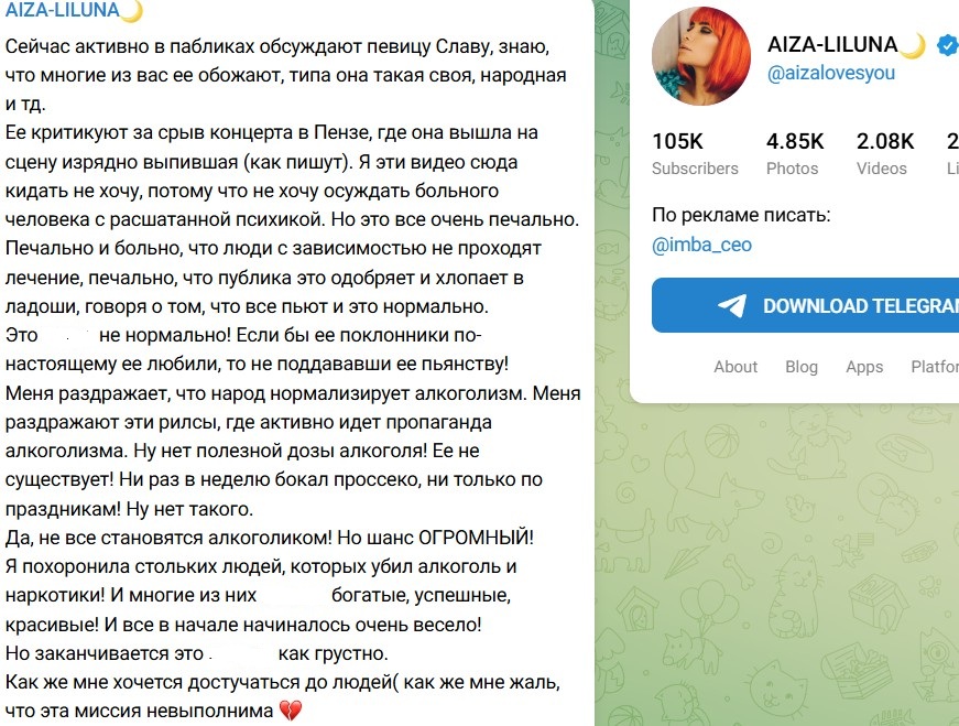 "Сейчас активно в пабликах обсуждают певицу Славу, знаю, что многие из вас ее обожают, типа она такая своя, народная и тд. Ее критикуют за срыв концерта в Пензе, где она вышла на сцену изрядно выпившая (как пишут). Я эти видео сюда кидать не хочу, потому что не хочу осуждать больного человека с расшатанной психикой. Но это все очень печально. Печально и больно, что люди с зависимостью не проходят лечение, печально, что публика это одобряет и хлопает в ладоши, говоря о том, что все пьют и это нормально. Это ... не нормально! Если бы ее поклонники по-настоящему ее любили, то не поддававши ее пьянству!(орфография и пунктуация автора сейчас и далее сохранены)", - отреагировала Айза на скандальное поведение певицы Славы.