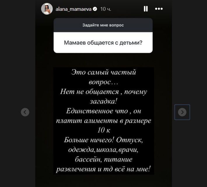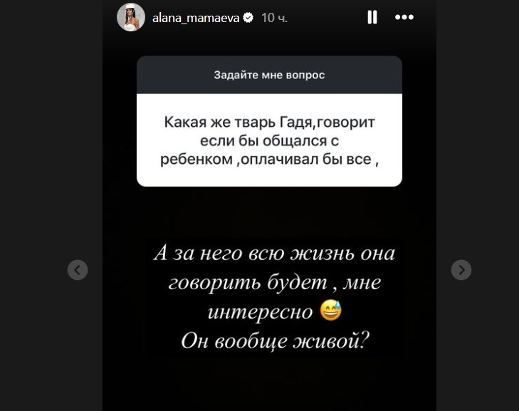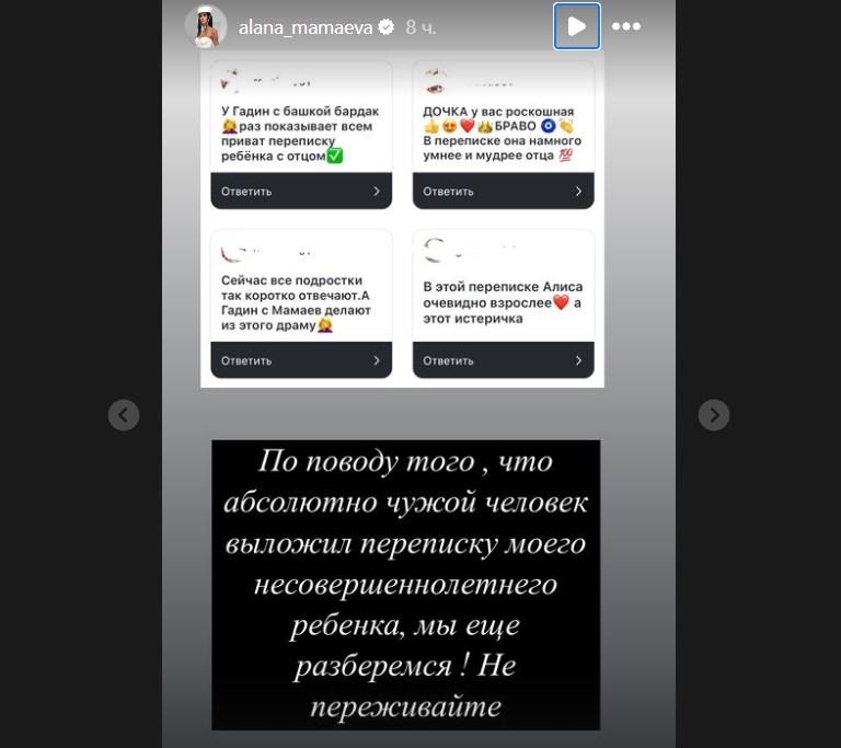 Алана Мамаева ответила на ряд вопросов своих подписчиков, рассказав о нынешних отношениях Павла с дочерью, а также прокомментировав посты Надежды Санько. Алане не пришлась по душе попытка нынешней супруги Мамаева оценить общение дочери с отцом - Надежда же обратила внимание поклонников на резкость, с которой Алиса общается с отцом.