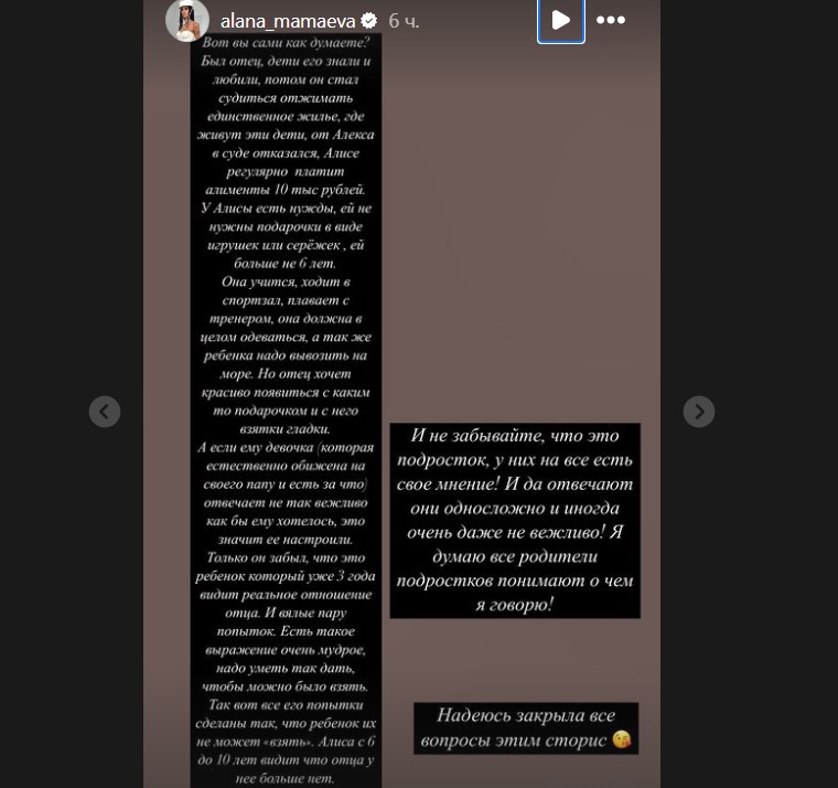 Почему Мамаев не участвует в жизни дочери, стоит только догадываться. Каждая из сторон обвиняет всех, кроме себя, а страдает при этом в первую очередь Алиса.