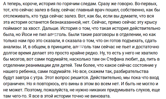 Черно призналась подписчикам, что хейтеры специально разносят слухи про пьющего Оганесяна, чтобы она оставалась в отделении с ребенком. Но у Саши с Иосифом договоренности, они меняются через день, чтобы выспаться дома, она уже с трудом держится на ногах и требует разбирательств.