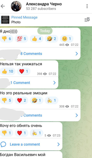 Черно снова собирается в Казань и минувшей ночью чуть не купила билет на самолет, но вовремя остановилась и попросила своих подписчиков написать Богдану, что она скучает и хочет к нему прижаться. Фанаты Чернявской сразу же откликнулись и начали искать способ достучаться до парня, отправляя ему сообщения. Александра Черно в нетрезвом виде продолжает преследовать Богдана Салангина, но на этот раз делает это чужими руками, потому что у Боди в чёрном списке.