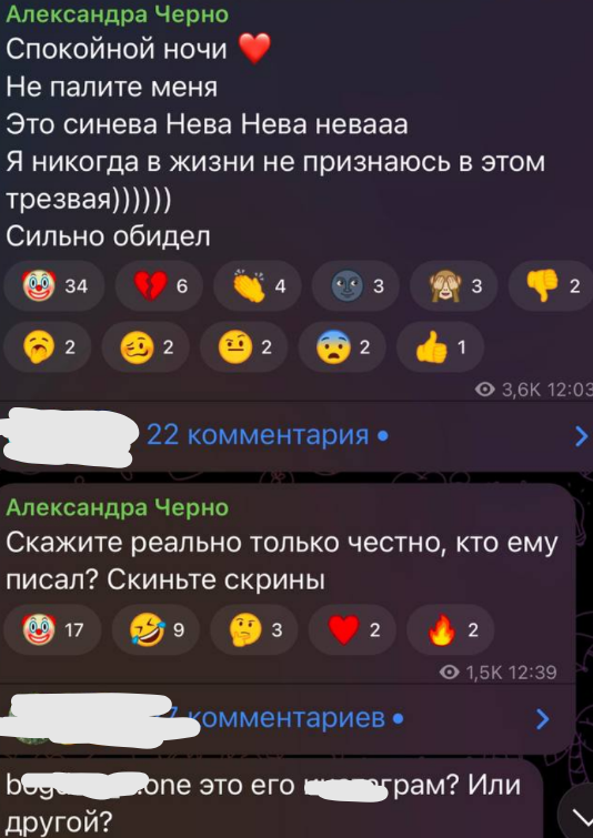 Расплескалась синева и понеслось. После съемочного дня Черно уехала в караоке, где проводила время с приятелем Максимом, кстати, в него она тоже была влюблена и эту историю мы обсуждали на шлоке - приходить на проект Максим категорически отказался. Зато Богдан был на проекте и за это расплачивается до сих пор.