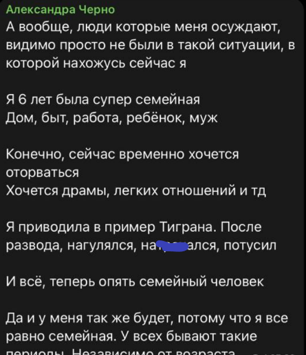 Ничем не хуже Черно, чем Салибеков, который не видит своих детей, хотя и платит в месяц 50 тысяч алиментов Юлии Колисниченко, и для определения порядка встреч с детьми придется выиграть очередной судебный процесс. Или Черно говорит о коротких романах под камерами и "туалетных" историях Тиграна? Для начала нужно Сане развестись или показать свидетельство о разводе с Оганесяном? Ну кто из парней захочет ухаживать под камерами за замужней дамой, зная про скандальный характер её супруга?