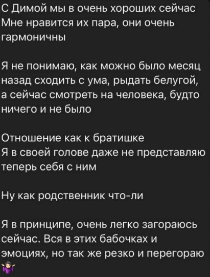 Зрителям Дома 2 уже не кажется странным, что звезда телепроекта ставит себя на один уровень с мужчинами и не видит разницы между своей жизнью и жизнью коллег по шоу. Александра Черно хочет до брака "нагуляться", как Тигран Салибеков. Черно опубликовала серию сторис и призналась подписчикам в желании получить весь спектр эмоций на телестройке - от драмы до бабочек в животе.
