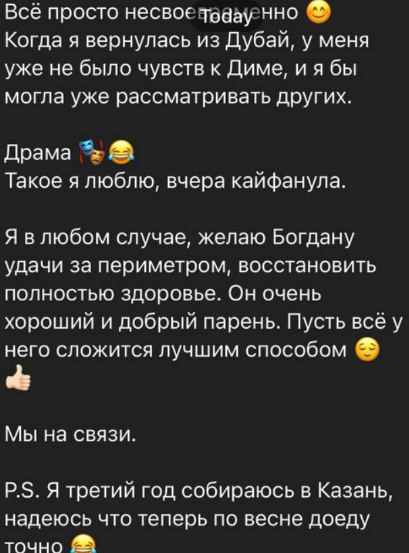 Саша прокомментировала уход с проекта Богдана Салангина и анонсирует интересные разборки и прощание с парнем, о чем мы уже писали на шлоке. Богдан непременно встретится с Черно в Казани, куда она давно мечтала поехать на экскурсию.