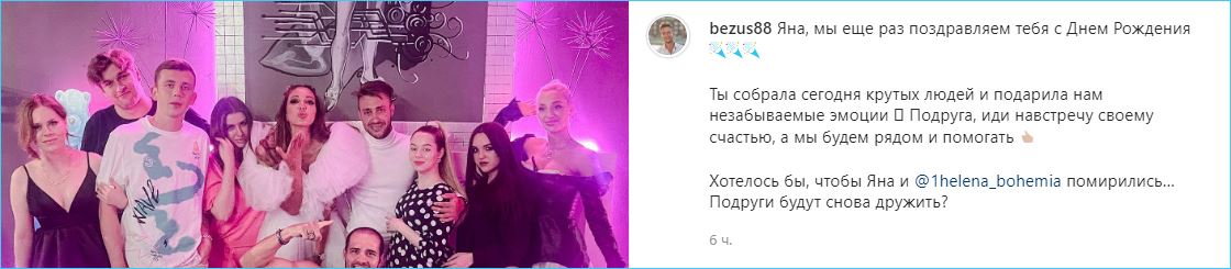Алексей Безус, в своем микроблоге не только похвастал, что свозил на вечеринку беременную Татьяну Репину, но и заявил, что среди крутых людей не хватает Алены Опенченко. Тем более, что в компании был её бывший кавалер Никита Балыкин, который ловит хайп на теме своей влюбленности в Яну Захарову.