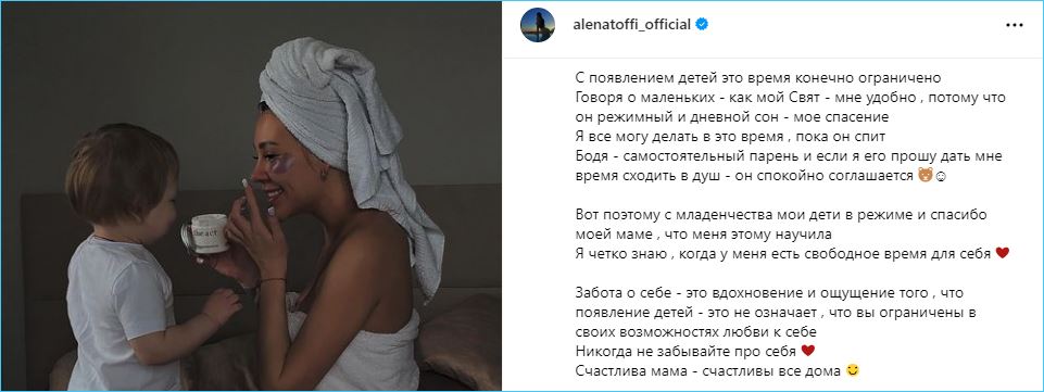 Решила Саша Черно перед отлетом в Дубаи поддержать свою подругу Алену Савкину-Сёмину в социальных сетях. Ведь Рапунцель-младшая, интригующая по-прежнему своей третьей беременностью подписчиков, выложила пост о том, что мамы всегда могут найти время на себя.