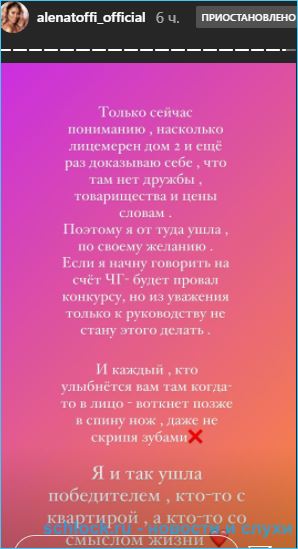 Там нет дружбы, товарищества и цены словам - откровенничает Савкина, непонятно на кого намекая. Она считает, что ушла победителем - кто-то остался с квартирой, а кто-то со смыслом жизни.