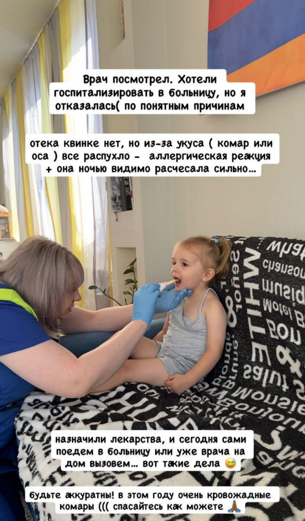 Устиненко сразу же сделала фото и видео с покусанной дочкой и обсудила с подписчиками вероятность того, что у малышки будет отёк Квинке. В больницу Алиана не поехала, а предпочла вызвать на дом врача.