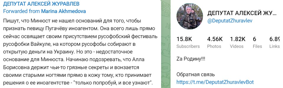"Пишут, что Минюст не нашел оснований для того, чтобы признать певицу Пугачёву иноагентом. Она всего лишь прямо сейчас освящает своим присутствием русофобский фестиваль русофобки Вайкуле, на котором русофобы собирают в открытую деньги на Украину. Но это - недостаточное основание для Минюста. Начинаю подозревать, что Алла Борисовна держит чьи-то грязные секреты и вонзается своими старыми ногтями прямо в кожу тому, кто принимает решения о ее иноагентстве - "только попробуй, и все узнают"(орфография и пунктуация автора сохранены)", - написал Журавлёв в своём телеграм-канале.