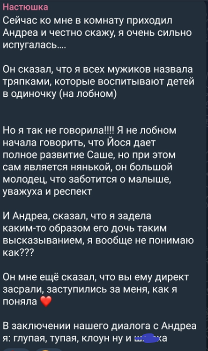 Андреа принял слова Брагиной про отцов-одиночек на свой счёт, приходил к Насте в женскую спальню извиняться, но разругался в пух и прах. Анастасии Брагиной приходится отбиваться от друзей Саши Черно, Настю поддерживают зрители Дома 2, о чем мы писали на шлоке, но в коллективе у неё сторонников нет.