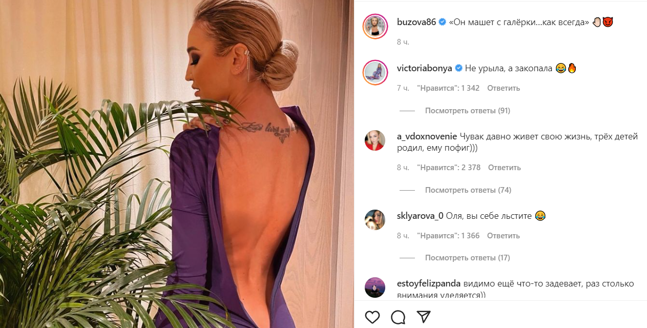 Дмитрий Тарасов предпочел проигнорировать выпад в его сторону бывшей супруги и сделал вид, что общается с другими гостями, которые сидели с ним за одним столиком. Но его жена не сдержалась. Анастасия Костенко заступилась за Тарасова, которого оскорбила Бузова, и в личном блоге написала ответ певице: "В карете прошлого далеко не уедешь. «На дне». Максим Горький". Тем самым Костенко дала понять, что время для хайпа ушло и Бузова опозорила лишь себя, а не Тарасова.