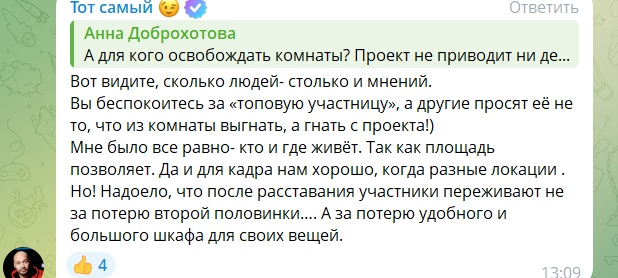 Выселение Элины Рахимовой из отдельной комнаты, о чем мы рассказывали на шлоке, Черкасов поддерживает и настаивает, чтобы участники держались за отношения, а не дорожили личным пространством. Рахимова и Елена Тепловодская сегодня над темой выселения посмеялись в историях Телеграма, они не верят, что ведущий добьется переезда Элины в женскую спальню, потому что новых пар на Доме 2 нет. Ждём ответ Черкасова?