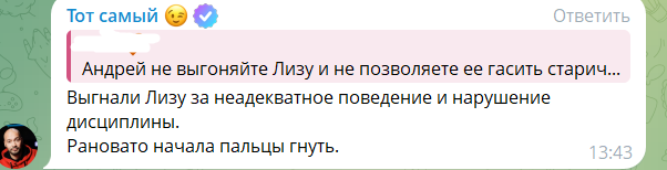 Оказывается, Лизу Крымкину, которая поссорилась с Элиной Рахимовой, Еленой Тепловодской и Катей Квашниковой, выгнали за нарушение дисциплины - "Слишком рано начала гнуть пальцы". Значит, топчикам позволено больше, чем новичкам. Организаторы проекта поддерживают "дедовщину", для чего это делается, как считаете?