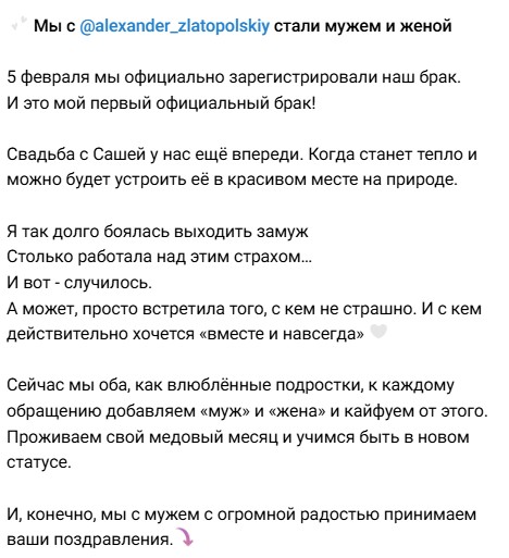 Напомним, брак с Александром Златопольским стал первыми официальными отношениями Анфисы Чеховой. По её словам, ранее она не раз слышала в свой адрес предложение руки и сердца, но только Александр смог добиться от неё желания выйти замуж. "Это мой первый официальный брак. Всю жизнь я была бракофобом и сбежавшей невестой, ибо предложений в моей жизни было немало. Выйти замуж решилась только сейчас, – призналась поклонникам ведущая. – Я так долго боялась выходить замуж и так много работала над тем, чтобы перестать бояться. А может быть, просто встретила того, с кем не страшно и действительно хочется вместе и навсегда", - написала она на своей странице в социальных сетях. "Свадьба с Сашей у нас впереди, когда станет тепло, и можно будет сделать её в красивом месте на природе, как нам хотелось бы. Сейчас мы отпраздновали рождение семьи, официальную регистрацию в кругу родных и самых близких. Это было красиво и очень душевно", - поделилась она своими эмоциями с подписчиками.