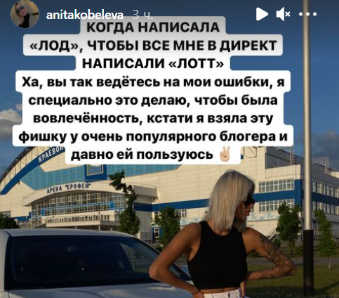 Недавно Анита Кобелева рассказала как обманывает подписчиков - специально пишет в сторис фразы с ошибками, чтобы наивные зрители дома 2 дали реакцию. Она этому научилась у одного известного блогера, интересно, у кого, у Феди Стрелкова? Она хочет сказать, что правильно писать "лот" с двумя буквами "т"?