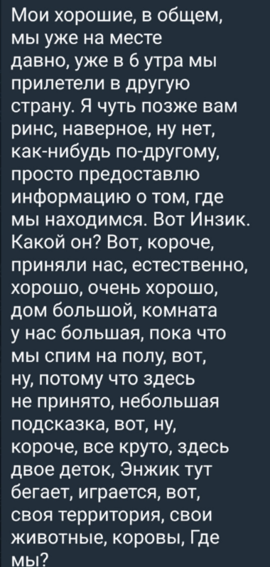 Пока нельзя сказать, насколько это успешный эксперимент, потому что Анна Самонина сообщила подписчикам, что они будут спать на полу. Она предложила зрителям Дома 2 угадать, где свободно гуляют коровы, много животных, бегают дети и жизнь комфортна и спокойна.