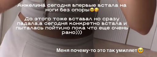 Анна Самонина записала видео про успехи Анджелины и сообщила подписчикам, что её умиляют попытки ребенка ходить, хотя экс-участница Дома 2 понимает, что это не полноценные самостоятельные шаги, опережение в развитии Анджелины Самонину приводит в восторг, ведь чаще всего дети начинают ходить без поддержки после года.
