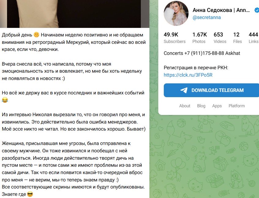 "Из интервью Николая вырезали то, что он говорил про меня, и извинились. Это действительно была ошибка менеджеров. Моё эссе никто не читал. Но все закончилось хорошо. Бывает) Женщина, присылавшая мне угрозы, была отправлена к своему мужчине. Он тоже извинился и пообещал с ней разобраться. Иногда люди действительно творят дичь на пустом месте — и потом сами же имеют проблемы из-за этой самой дичи. Так что если появится какой-то очередной вброс про меня — не верим, мы-то теперь знаем правду :) Все соответствующие скрины имеются и будут опубликованы. Знаете где 😎", - поделилась она последними новостями из своей жизни Анна.