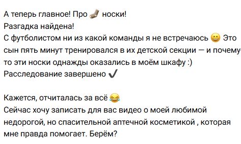Как стало известно благодаря изданию СтарХит, Анне Седоковой приписывается роман с женатым мужчиной. Чтобы раз и навсегда закрыть ту тему, Седокова опровергла слухи об отношениях с женатым футболистом. Как написала на своей странице в социальных сетях сама Анна, ей на регулярной основе приписываются романы с женатыми мужчинами. Да, знаки внимания подобные мужчины ей оказывают, но строить с ними отношения в её планы не входит. "Про 🧦 носки! Разгадка найдена! С футболистом ни из какой команды я не встречаюсь 😄 Это сын пять минут тренировался в их детской секции — и почему-то эти носки однажды оказались в моём шкафу :) Расследование завершено ✔️", - отчиталась она перед своими верными поклонниками.