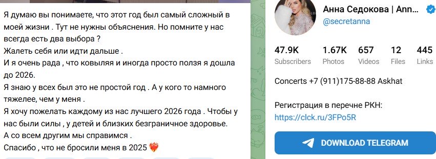 Седокова поздравила подписчиков с наступившим 2026 годом, заметив - для кого-то этот год выдался на порядок тяжелее. "Я думаю вы понимаете, что этот год был самый сложный в моей жизни . Тут не нужны объяснения. Но помните у нас всегда есть два выбора ? Жалеть себя или идти дальше . И я очень рада , что ковыляя и иногда просто ползя я дошла до 2026. Я знаю у всех был это не простой год . А у кого то намного тяжелее, чем у меня(орфография и пунктуация автора сохранены)", - написала на своей странице певица. "Я хочу пожелать каждому из нас лучшего 2026 года . Чтобы у нас были силы , у детей и близких безграничное здоровье. А со всем другим мы справимся . Спасибо , что не бросили меня в 2025 ❤️🔥", - добавила она.