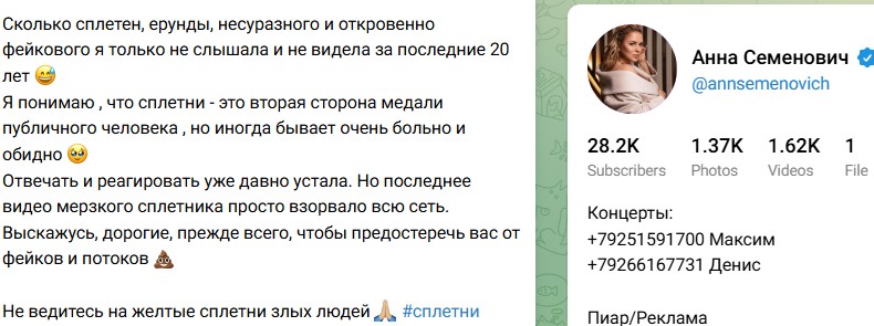Семенович отреагировала на появление в Сети своего фотоснимка с отдыха, посмеявшись над животом, который умелец "пририсовал" ей сбоку. "Сколько сплетен, ерунды, несуразного и откровенно фейкового я только не слышала и не видела за последние 20 лет. Я понимаю, что сплетни — это вторая сторона медали публичного человека, но иногда бывает очень больно и обидно. Отвечать и реагировать уже давно устала. Но последнее видео мерзкого сплетника просто взорвало всю Сеть. Выскажусь, дорогие, прежде всего, чтобы предостеречь вас от фейков и потоков. А если вы хотите увидеть эти «шедевры» — забегайте в соцсети. Наслаждайтесь искусством кустарного ИИ и фотошопа. Не видитесь на желтые сплетни злых людей", - написала на своей странице певица, прикрепив видеозапись, на которой отчётливо видно отсутствие у неё "беременного" живота.