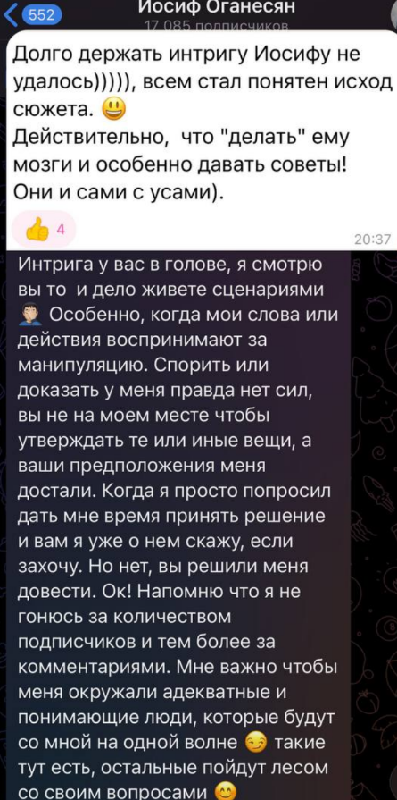 Иосиф Оганесян ведёт с Сашей переговоры насчёт нахождения ребёнка на Доме 2, но его подписчики уверены, что вместо Йоси им отвечает в телеграм-канале его супруга. По всей видимости, Оганесяны помирились. Не потому ли Иосифу срочно понадобился отдых и он заявил о сердечном заболевании, которое мешает самостоятельно, без Черно, растить сына? А ведь ещё вчера Иосиф квартиру собирался себе и Стефану покупать?