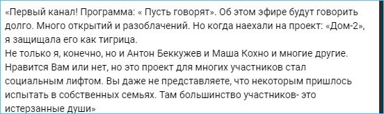 Выяснилось, что Антон Беккужев, Светлана Прель и Мария Кохно были вынуждены защищать Дом 2, который пытались представить как рассадник аморальщины и бесстыдства на телевидении.
