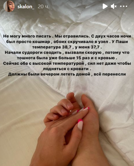 Бывшие участники Дома 2 отправились на отдых, но не успели они насладиться морским воздухом, ресторанами и аттракционами, как застряли с высокой температурой в гостиничном номере. Бабич и Скалон слегли после отравления в Геленджике, поехали Катя и Павел на курорт на три дня, но им пришлось продлить свой мини-отпуск и даже вызвать скорую, настолько серьёзным было недомогание.