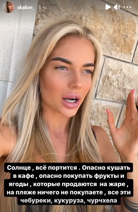 Скалон винит в своих бедах и болезни недостаточный сервис, грязное море, немытые фрукты, некачественную еду и антисанитарию - всё, что угодно, кроме как себя. Она перепугалась за здоровье спортсмена Бабича, но за два дня, до внезапной болезни, всё же успела сделать цикл видео и фотоматериала, чтобы после возвращения в Москву разместить в своём блоге.