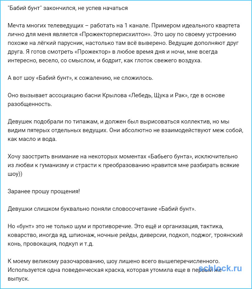 Мечта многих телеведущих – работать на 1 канале. Примером идеального квартета лично для меня является «Прожекторперисхилтон». Это шоу по своему устроению похоже на лёгкий парусник, настолько там всё выверено. Ведущие дополняют друг друга. Я готов смотреть «Прожектор» в любое время дня и ночи, мне всегда интересно, весело, со смыслом, и бодрит, как глоток свежего воздуха.