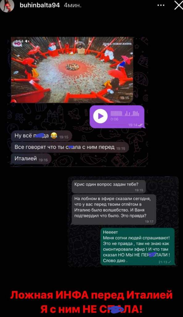Кристина Бухынбалтэ после того, как ей начали высказывать претензии поклонницы, принялась отказываться от последнего интима с Барзиковым и заявила, что Лобное ночного выпуска 25.10.2023 смонтировали неправильно, исказив происходящее неделю назад. Но Орлова говорила чётко - "перед Кристининым отъездом". Зачем ведущей выставлять свою фаворитку легкодоступной? Как после такой информации о свободных отношениях у Барзикова и Бухынбалтэ язык поворачивается читать другим участникам нотации?