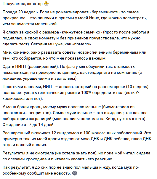 В личном блоге Яна рассказала, какое важное обследование они с мужем прошли и как долго ждали результата. Она надеется, что муж скоро приготовит для неё сюрприз и объявит пол малыша в торжественной обстановке.