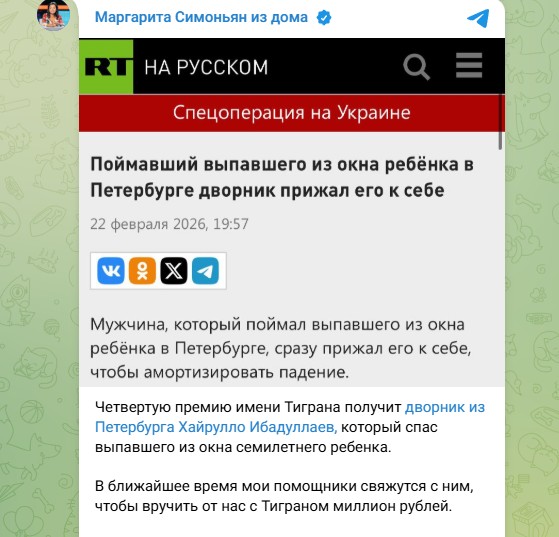 "Четвертую премию имени Тиграна получит дворник из Петербурга Хайрулло Ибадуллаев, который спас выпавшего из окна семилетнего ребенка. В ближайшее время мои помощники свяжутся с ним, чтобы вручить от нас с Тиграном миллион рублей.", - отреагировала на новость Маргарита Симоньян. Ибадуллаев находится в России на заработках - он мечтает об автомобиле и хочет помочь своей семье, оставшейся в Узбекистане, встать на ноги. Возможно, переданный журналисткой миллион дворник потратит на машину, но если этого не произойдёт - россияне требуют у матери выпавшего ребёнка осуществить мечту спасителя. Блогер, чей сын выпал из окна 7-го этажа, продолжает отмалчиваться. И даже благодарить спасителя своего сына почему-то не торопится. Быть может, Надежда пока не может прийти в себя после произошедшего, и именно с этим связано её молчание.