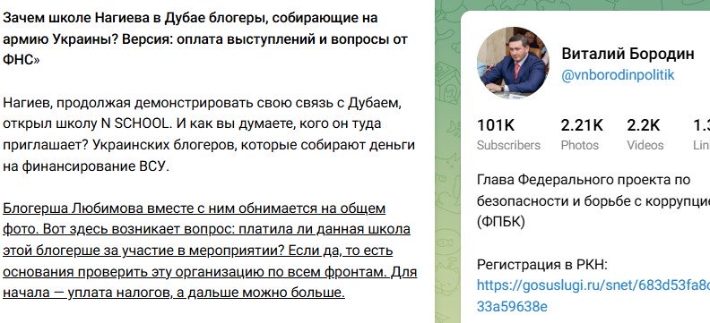 "Нагиев, продолжая демонстрировать свою связь с Дубаем, открыл школу N SCHOOL. И как вы думаете, кого он туда приглашает? Украинских блогеров, которые собирают деньги на финансирование ВСУ. Блогерша Любимова вместе с ним обнимается на общем фото. Вот здесь возникает вопрос: платила ли данная школа этой блогерше за участие в мероприятии? Если да, то есть основания проверить эту организацию по всем фронтам. Для начала — уплата налогов, а дальше можно больше(орфография и пунктуация автора сейчас и далее сохранены)", - написал на своей странице Виталий Бородин.