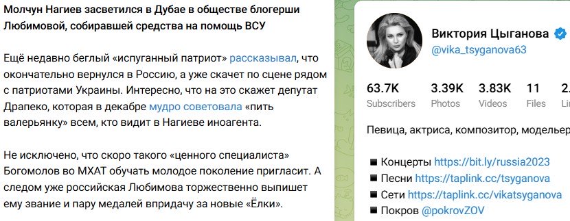"Ещё недавно беглый «испуганный патриот» рассказывал, что окончательно вернулся в Россию, а уже скачет по сцене рядом с патриотами Украины. Интересно, что на это скажет депутат Драпеко, которая в декабре мудро советовала «пить валерьянку» всем, кто видит в Нагиеве иноагента. Не исключено, что скоро такого «ценного специалиста» Богомолов во МХАТ обучать молодое поколение пригласит. А следом уже российская Любимова торжественно выпишет ему звание и пару медалей впридачу за новые «Ёлки».", - вторит главе ФПБК Вика Цыганова.