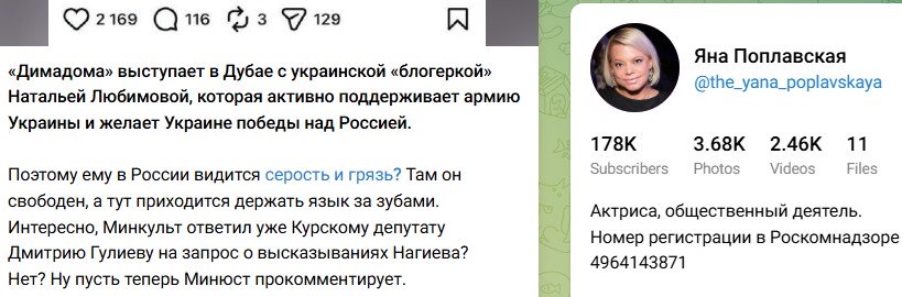 Что касается Яны Поплавской, то она считает, Дмитрию просто приходится держать язык за зумами, находясь на территории Российской Федерации, а за её пределами он, чувствуя себя свободным, демонстрирует своё истинное лицо. "«Димадома» выступает в Дубае с украинской «блогеркой» Натальей Любимовой, которая активно поддерживает армию Украины и желает Украине победы над Россией. Поэтому ему в России видится серость и грязь? Там он свободен, а тут приходится держать язык за зубами. Интересно, Минкульт ответил уже Курскому депутату Дмитрию Гулиеву на запрос о высказываниях Нагиева? Нет? Ну пусть теперь Минюст прокомментирует.", - поддержала она Цыганову и Бородина в их негодовании. "Красная шапочка" уверена, если Минюст решит проверить деятельность Нагиева, его последние слова и поступки - итог проверок сможет удивить каждого.