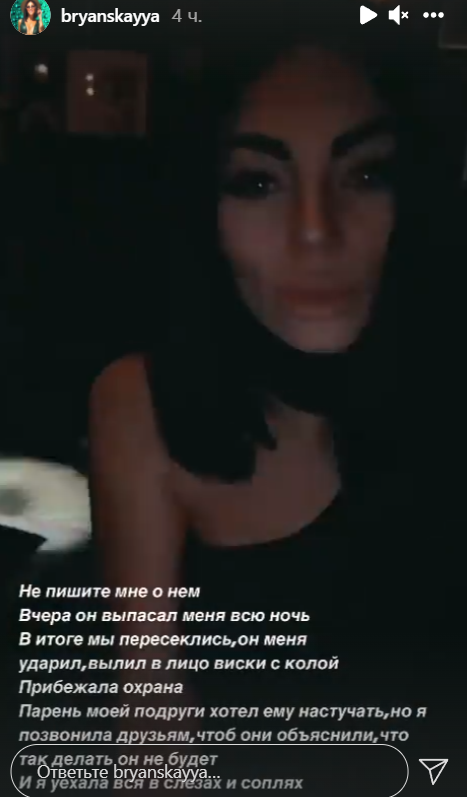 Очередная встреча за периметром Анны Брянской и Алексея Адеева закончилась рукоприкладством. По словам девушки, она приехала в ночной клуб к своей подруге, увидела Лёшу, сначала они мило общались, но градус накалялся и в конце концов Адеев поднял на неё руку. Брянская спасла Адеева от привода в полицию, уговорила охрану замять ситуацию, но в очередной раз убедилась, что им нельзя отдыхать в одной компании.