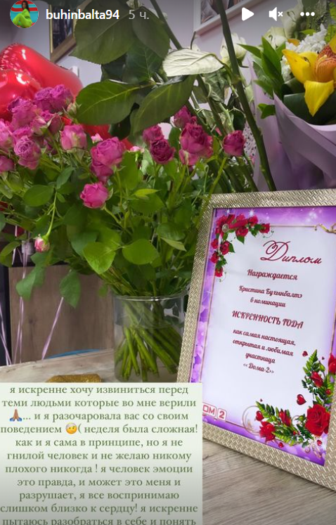 Через несколько дней, по эфирам, Кристина узнает, что Грант ей отомстил и поставил на заставку в телефоне её фотографию с фотошопом, там, где она толстая, это показали на Лобном и они опять поссорились. Участники Дома 2 не верят в то, что Кристина и Артём смогут быть вместе и что их отношения искренние, построенные на чувствах. Нашла Бухынбалтэ партнера для хайпа? Почему же она боится выглядеть некрасиво под камерами и извиняется перед мамой и своими подписчиками?