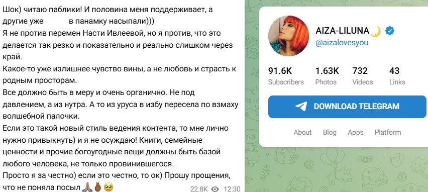 Айзу поддержало большое количество её же подписчиков, но часть из них была возмущена критикой человека, который по сути ничего плохого не сделал. Айза поторопилась объяснить свой пост, посвящённый Насте. "Я не против перемен Насти Ивлеевой, но я против, что это делается так резко и показательно и реально слишком через край. Какое-то уже излишнее чувство вины, а не любовь и страсть к родным просторам. Все должно быть в меру и очень органично. Не под давлением, а из нутра. А то из уруса в избу пересела по взмаху волшебной палочки.", - пояснила она.