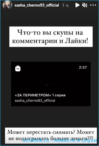 Прошло меньше суток и стало известно, что Черно недовольна низкой активностью зрителей её сериала. "Почему так мало лайков и комментариев, может, мне перестать разыгрывать деньги?", - спрашивает Александра у своих и без того выдрессированных фолловеров. Она вообще чем-нибудь бывает довольна в этой жизни?