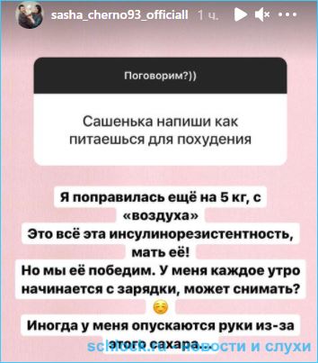 У Саши Черно инсулинорезистентность. Она давно уже рассказывает подписчикам, что ходит по врачам и специалистам, пытаясь решить проблему со здоровьем, постоянно сидит на правильном питании, но в последние месяцы стремительно набирает вес. Если верить Саше, то она поправилась из-за своего заболевания. Опять плюс пять, теперь бывшая участница дома 2 делает зарядку и хочет показать своим поклонницам, к чему это приведет.