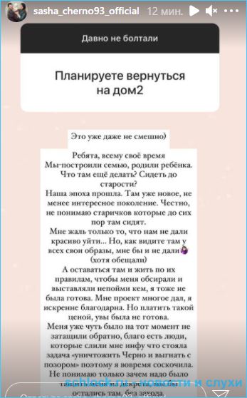 Всему своё время. Бывшая участница Александра Черно уверена, что старым участникам дома 2 пора домой. Саша не понимает, что делают на проекте "старички", если новые герои по-своему интересные и активные. "Что там делать, до старости сидеть?", - вопрошает в пустоту Черно.