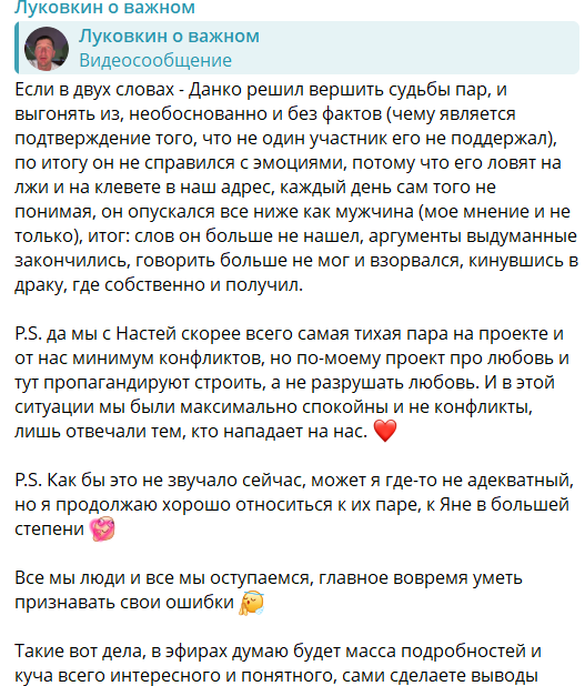 Даниилу Кораблёву не удалось выгнать с проекта на голосовании своих конкурентов - Диму Луковкина и Настю Филиппову. По словам Дмитрия, у Даниила не хватило аргументов и в ход пошли кулаки, первый удар Дима пропустил, а потом Данко был повержен. Силы были неравны. Самое забавное, что Данко и Дмитрий Луковкин устроили потасовку из-за Насти Филипповой. Даниила не устраивает, что его бывшая девушка скрывает правду или недоговаривает, делая вид, что забыла или не придала значения своим поступкам, а Луковкин прикрывает любые оправдания Насти.