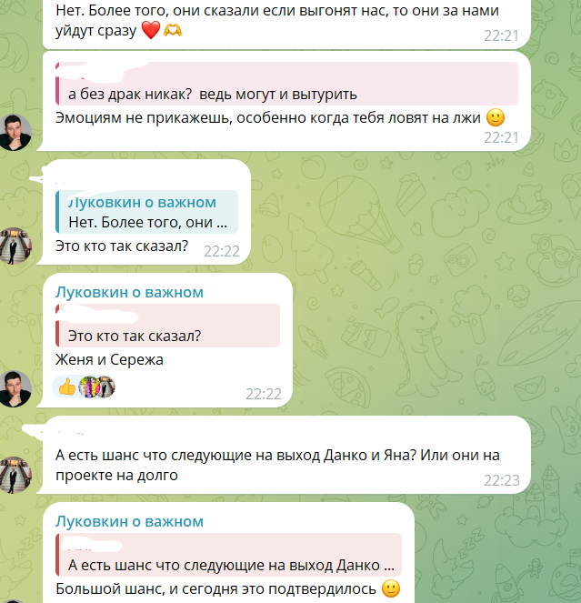Выяснилось, что позиция Тырлышкиной на проекте шаткая, а у Луковкина сговор с Хорошевыми. Женя и Сергей заявили, что тоже покинут проект, если Диму и Настю выгонят на голосовании. Задача Тырлышкиной теперь состоит в том, чтобы разбить коалицию. Кто ушел с проекта, узнаем из эфиров Дома 2 05.09.25, тогда и обсудим на шлоке шансы Яны на вылет за забор.