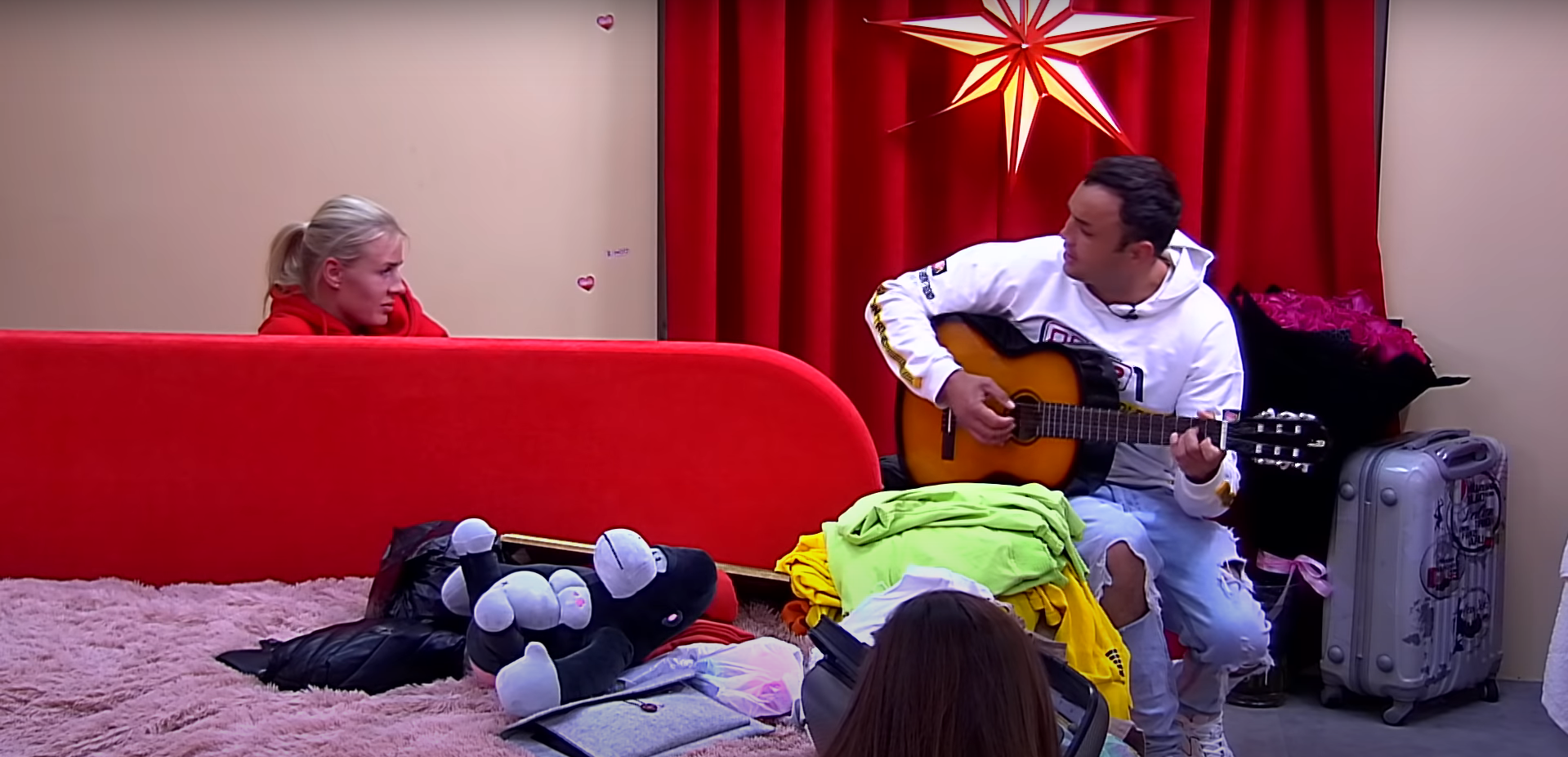 После бегства Маши Гобозов с графином и Полиной Малининой сначала залез в капсулу, затем пошел изливать душу Лясковец, прошелся с гитарой по общей кухне, но понял, что народ устал от его песен, и Сашу забрала на коленки Надя Ермакова. Вот там он уже всплакнул, не забывая потягивать "несок" из кружки.