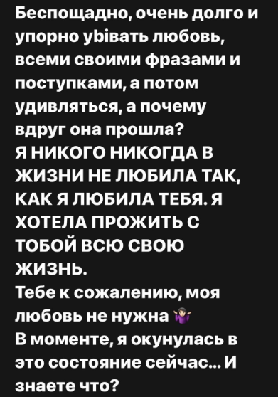 Иосиф Оганесян решил расстаться с супругой, пользуясь тем, что они находятся на доме 2 и у него есть поддержка в коллективе. Так как именно Саше ведущие и участники постоянно говорят о загулах и флирте с посторонними мужчинами, Иосиф занял выигрышную позицию, а его жена решила жаловаться на жизнь. "Даже не покаялся" - Черно предъявила претензии сбежавшему Оганесяну. Якобы он своими насмешками и поступками уничтожил в ней желание любить, растоптал её чувства и теперь Александра никому не сможет доверять.